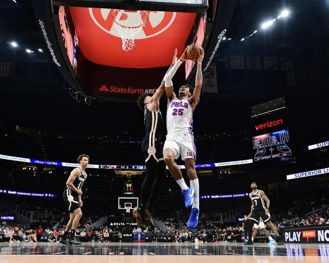 老鷹過去5場收獲5連勝,76人上一場主場106-102險勝爵士,本賽季前三次交鋒老鷹均戰勝76人。本場76人缺少恩比德、喬治、埃奇庫姆,老鷹缺少庫明加。首節比賽前4分鐘,雙方持續緊咬比分纏斗至76人13-14落后,杰倫暴扣,76人一波9-0攻勢反超6分。76人多點開花逐步擴大33-22領先,并在之后擴大28-26領先優勢,老鷹再追3分,首節比賽結束76人38-29領先老鷹9分優勢。