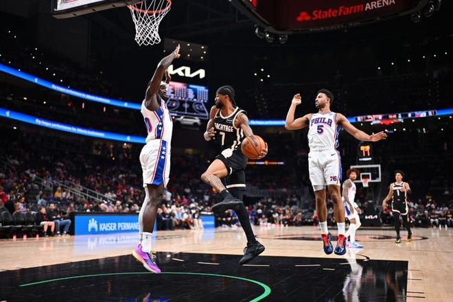 中場休息回來,76人進攻火力大幅下滑第三節首次單節不足30分,老鷹連續兩節單節得分30+。76人第三節三分6中0顆粒無收,馬克西與格萊姆斯相繼得分20+,但老鷹憑借首發五人組的出色進攻逐步反超比分,76人單節21-31輸掉10分,三節結束76人94-97被老鷹反超。前三節比賽,76人三分19中8,馬克西23分、格萊姆斯21分與烏布雷19+5+4;老鷹三分22中10,杰倫24+7+4與麥科勒姆16分,引領首發五人全部得分上雙。